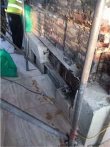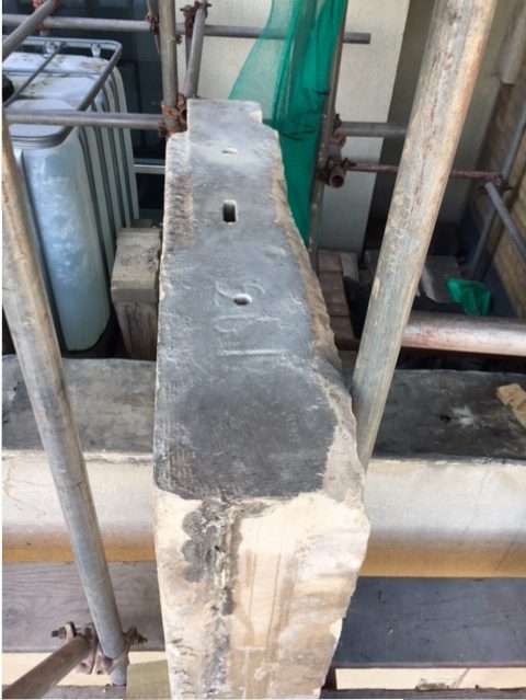 Following erection of scaffold access a closer inspection was carried out and it became clear that the large steel beams of the building were eroded by water ingress over the years which had expanded and caused a lot of movement in the stone.