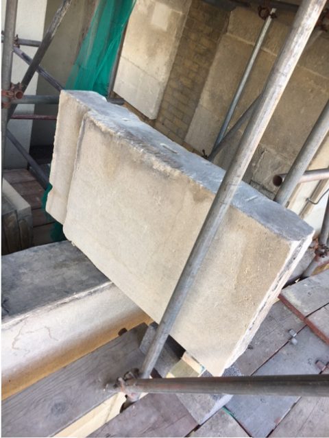 As Some of the stone units we had to remove and refix are almost half a ton in weight, we have had to use traditional lifting methods of split pins and manual chain blocks.